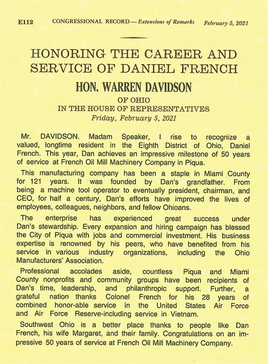 Honoring Daniel P. French, 50 Years of Service at French Oil Mill Machinery Company