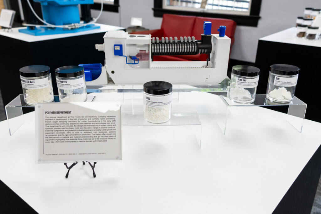 The polymer department at The French Oil Mill Machinery Company represents decades of development in the field of polymer and synthetic rubber processing. French began designing machinery for rubber manufacturing in the early 20th century and has continually adapted to new materials and technologies ever since. This department’s work includes the design and manufacture of rubber mixers and hydraulic presses used to shape, mold, and dewater a range of polymer products. From tire components and gaskets to industrial seals and specialty rubber goods, the equipment developed here is built to withstand high pressures, extreme temperatures, and the rigors of continuous production. This display offers insight into the mechanical innovations and material understanding that go into each piece of equipment, highlighting how essential these machines are to the products we rely on every day—from cars and airplanes to medical devices and infrastructure.