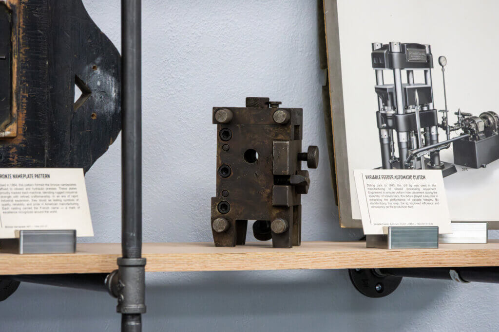 Dating back to 1943, this drill jig was used in the manufacturing of oilseed processing equipment. Engineered to ensure uniform hole placement during the assembly of screen bars, this fixture played a key role in enhancing the performance of variable feeders. By standardizing this step, the jig improved efficiency and consistency on the production floor.