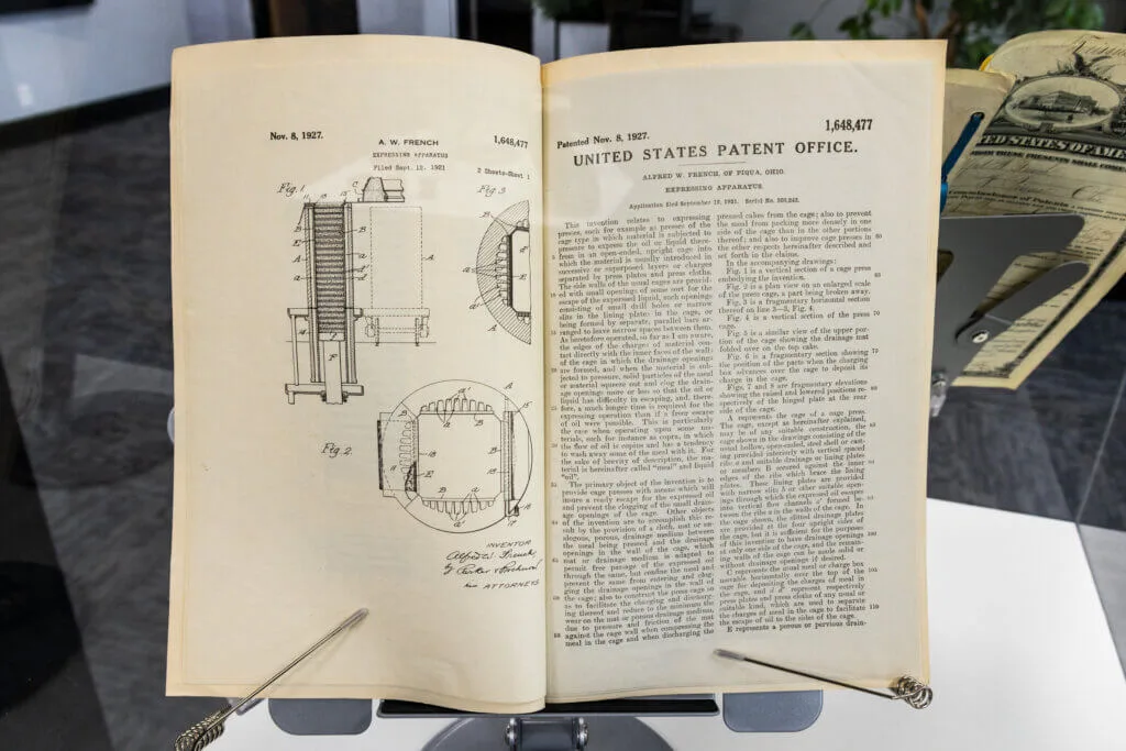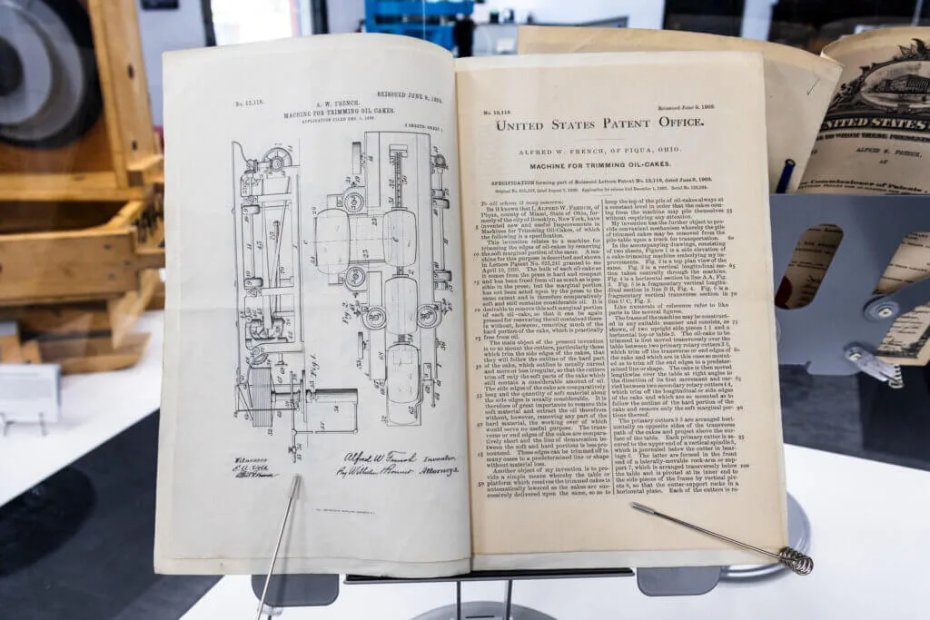 Awarded in 1903, U.S. Patent No. 12,118 marked a breakthrough invention by Alfred W. French Sr., founder of The French Oil Mill Machinery Company. His mechanical innovation significantly improved the efficiency of expressing oil from seed cakes during a period when the vegetable oil industry was shifting from manual to mechanized production. His design helped standardize oil cake formation and regulate hydraulic pressure, key advancements that were soon widely adopted throughout the linseed and cottonseed oil industries. This patent not only reflects Mr. French’s engineering ingenuity but also represents the foundational moment in the legacy of a company that would help shape oilseed processing around the world for generations to come.