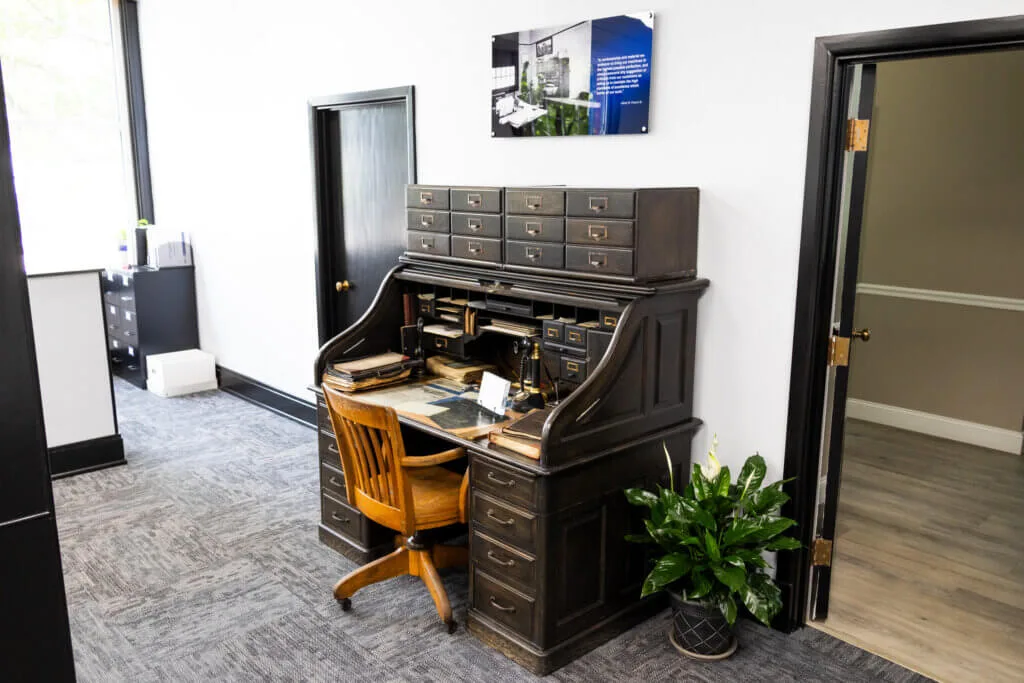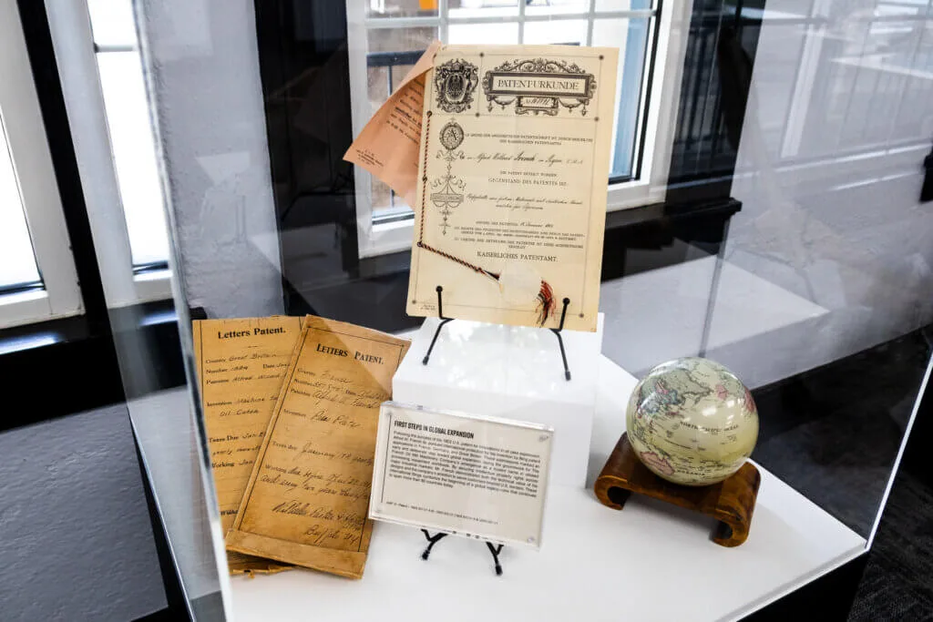 More than a piece of furniture, this desk is a preserved link to the early years of The French Oil Mill Machinery Company and to the engineer whose vision helped shape a global industry. From this desk, Alfred Willard French Sr. developed groundbreaking ideas—among them, patents for a linseed cake trimmer and an automatic hydraulic valve that became standards in oilseed processing. The surface is arranged with original artifacts that reflect the focused rhythm of his work: ledgers tracking early sales, contracts and international documents, handwritten letters, a rotary phone, a slide rule, and a desk calendar. Together, they offer a glimpse into the daily life of a meticulous and forward-thinking inventor. What began as a visit in 1897 to troubleshoot machinery quietly became the starting point of something far greater: a legacy that would span generations and reach customers around the world.