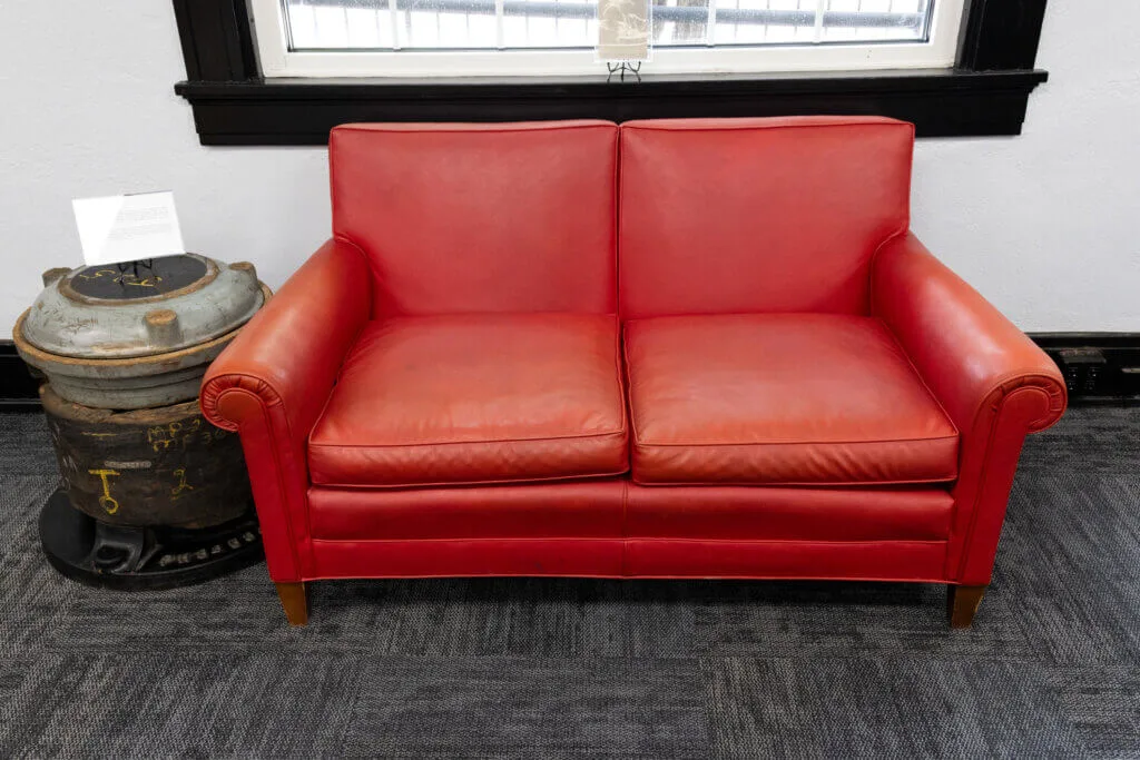 This particular loveseat was custom-ordered by Marjorie French as a gift for her husband, Alfred W. French Jr., then President of The French Oil Mill Machinery Company. Though originally intended for personal use, the loveseat eventually made its way to the French headquarters, where it now serves as a vibrant artifact of family heritage and enduring craftsmanship.