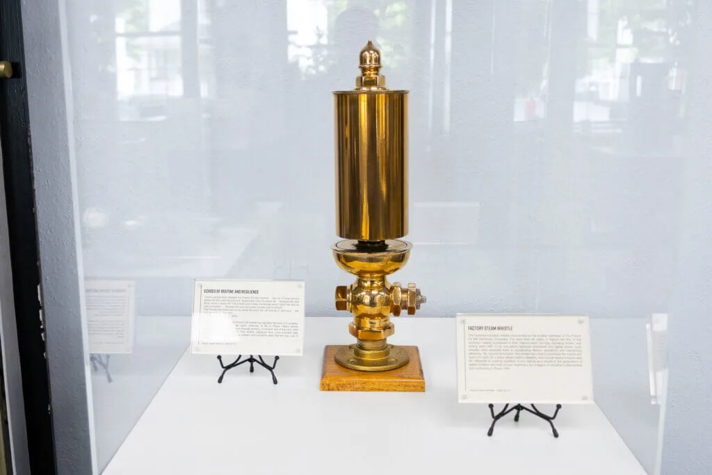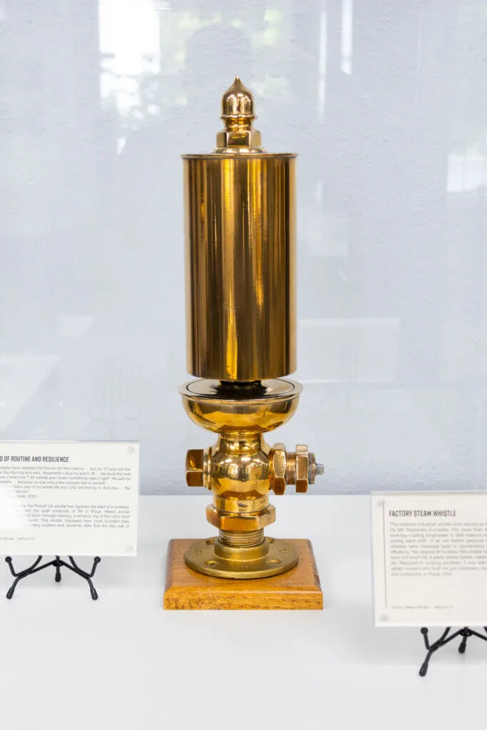 For more than a century, the French Oil whistle has signaled the start of a workday, the passing of time, and the quiet continuity of life in Piqua. Heard across neighborhoods and passed down through memory, it remains one of the city’s most familiar—and beloved—sounds. This whistle, displayed here, once sounded daily from the factory roof, reminding workers and residents alike that the day was in motion.