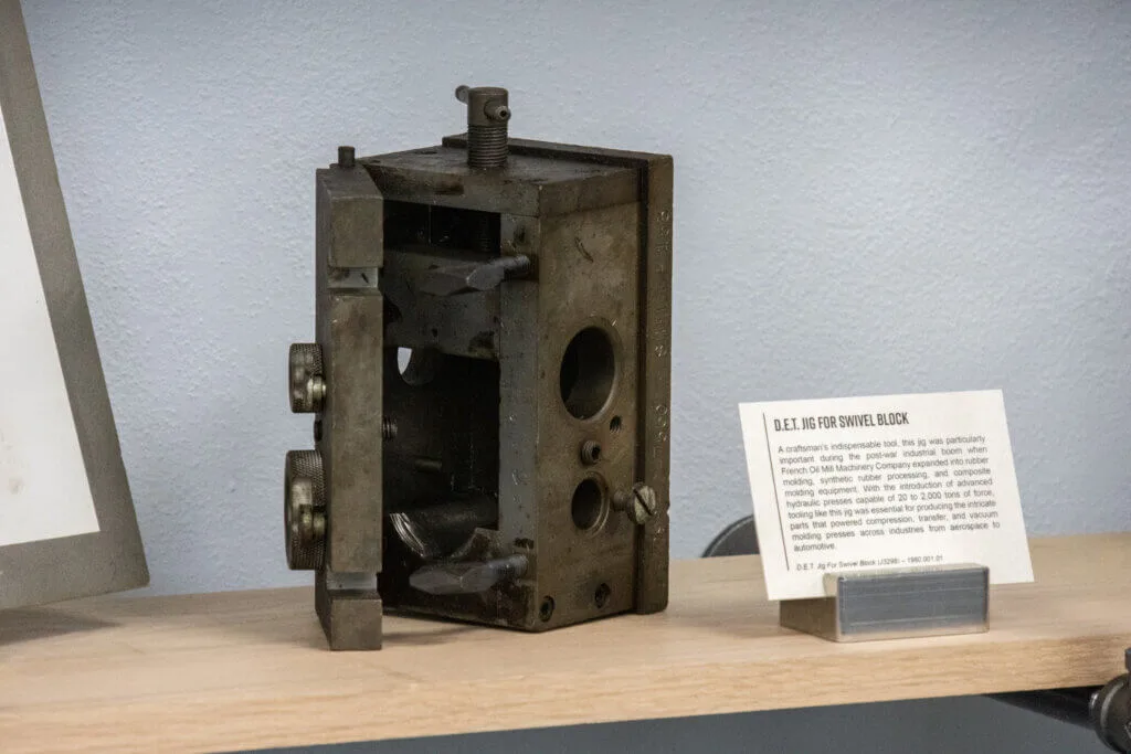 A craftsman’s indispensable tool, this jig was particularly important during the post-war industrial boom when French Oil Mill Machinery Company expanded into rubber molding, synthetic rubber processing, and composite molding equipment. With the introduction of advanced hydraulic presses capable of 20 to 2,000 tons of force, tooling like this jig was essential for producing the intricate parts that powered compression, transfer, and vacuum molding presses across industries from aerospace to automotive.