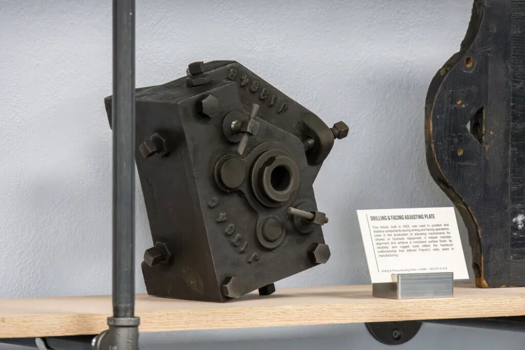 This fixture, built in 1923, was used to position and stabilize components during drilling and facing operations. Used in the production of adjusting mechanisms for oilseed or hydraulic equipment, it helped maintain alignment and achieve a consistent surface finish. Its reliability and rugged build reflect the hands-on craftsmanship that defined French’s early years in manufacturing.