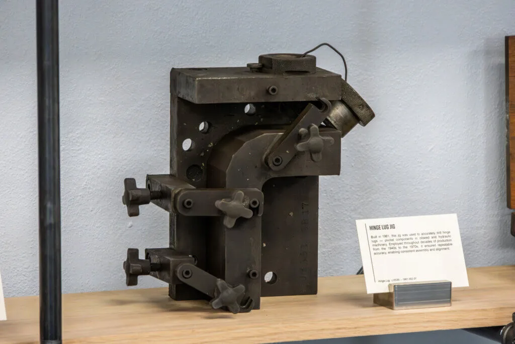 Built in 1961, this jig was used to accurately drill hinge lugs — pivotal components in oilseed and hydraulic machinery. Employed throughout decades of production from the 1940s to the 1970s, it ensured repeatable accuracy, enabling consistent assembly and alignment.