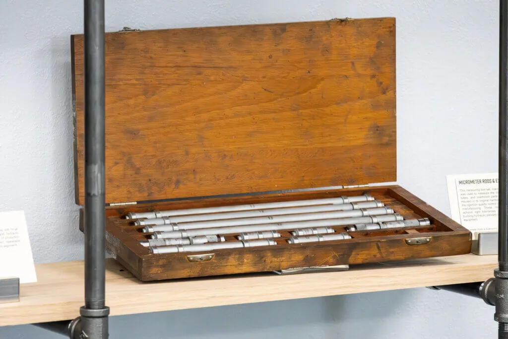 This measuring tool set, manufactured by Lufkin in 1963, was used to measure the internal dimensions of bores, tubes, and machined parts with exceptional accuracy. Housed in its original hardwood case, the set represents the rigorous quality control that defined mid 20th century manufacturing. These measuring extensions helped achieve tight tolerances and exact fits, essential for building hydraulic presses and other demanding industrial equipment.