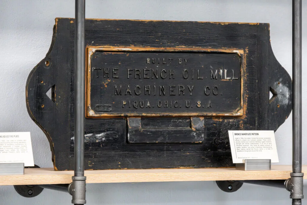 Used in 1954, this pattern formed the bronze nameplates affixed to oilseed and hydraulic presses. These plates proudly marked each machine, blending rugged industrial strength with refined craftsmanship. In an era of rapid industrial expansion, they stood as lasting symbols of quality, reliability, and pride in American manufacturing. Each casting carried the French name — a mark of excellence recognized around the world.