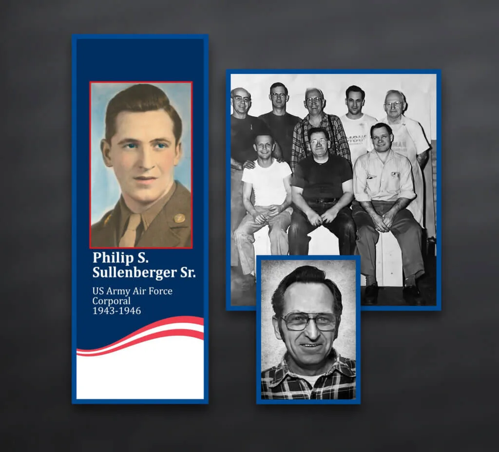 Frank Sullenberger (group back right) and his son, Philip S. Sullenberger Sr., (group back second from the right) embody a proud tradition of military service and industrial excellence, represented here with honor among our World War I and World War II veterans. Frank served in World War I with the 485th Aero Squadron in France, rising to Corporal in 1918 before his discharge in 1919 and later supported World War II efforts through the Ohio State Guard from 1942 to 1943.